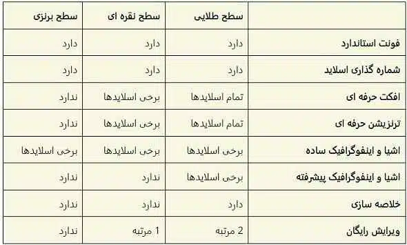 1- ابتدا پلن متناسب با نیاز خودتون رو انتخاب کنبد: تبدیل پایان نامه به پاورپوینت در سه سطح مختلف انجام میشه. برای پایان نامه سطح نقره ای و طلایی پیشنهاد میشه. هر کدوم از پلن ها یک سری ویژگی هایی دارن که در جدول زیر لیست کردیم.