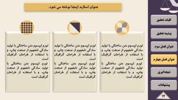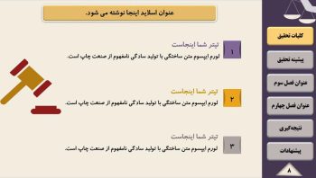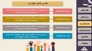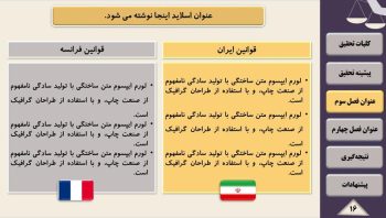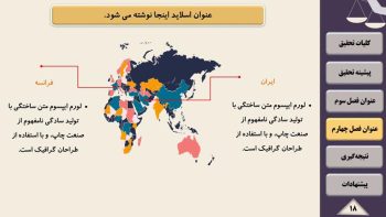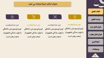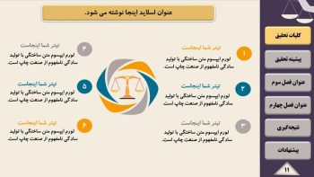 تیم پارس تز اقدام به گردآوری مجموعه ای کامل شامل تم و قالب آماده پاورپوینت برای آماده سازی سریع فایل پاورپوینت جهت ارائه پایان نامه و پروژه در سمینار یا کنفرانس نموده است. قالب پاورپوینت رشته حقوق یک قالب منودار جهت ارائه پایان نامه می باشد. قالب پاورپوینت پایان نامه حقوق قابل ویرایش و حرفه ای می باشد