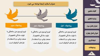 - طراحی اسلاید تخصصی برای تمامی بخش های مهم ارائه ی پاورپوینت پایان نامه و سمینار