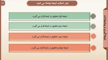 - اسلاید بندی تخصصی برای مقدمه، مروری بر بیشینه، روش تحقیق، نتایج، جمع بندی و پیشنهادات