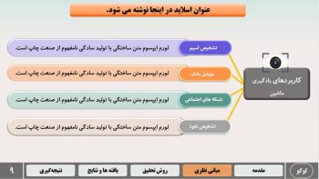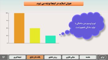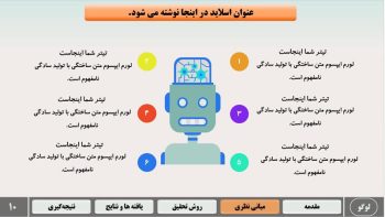 - طراحی اسلاید تخصصی برای تمامی بخش های مهم ارائه ی پاورپوینت پایان نامه و سمینار