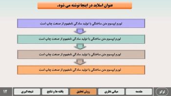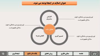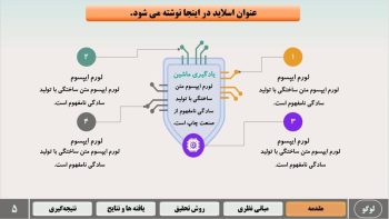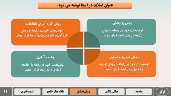 - اسلاید بندی تخصصی برای مقدمه، مروری بر بیشینه، روش تحقیق، نتایج، جمع بندی و پیشنهادات