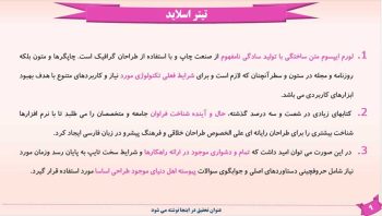 - طراحی اسلاید تخصصی برای تمامی بخش های مهم ارائه ی پاورپوینت پایان نامه و سمینار