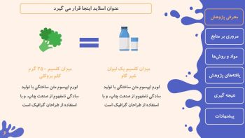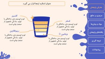 قالب حرفه ای پاورپوینت منودار (پایان نامه) طرح شیر و لبنیات یک قالب منودر جهت ارائه پایان نامه و … می باشدو با موضوع این قالب پاورپوینت، شیر و فرآورده های شیر، می باشد. در صورتی که موضوع ارائه شما، مرتبط با خواص لبنیات و ارزش غذایی آن ، مظالعه ویژگی های شیر، شیر گاو و گوسفند، انواع آلودگی های شیر و … است، این قالب قطعا انتخاب مناسبی می باشد. با دانلود قالب پاورپوینت شیر و لبنیات شما اینفوگرافیک های متعدد و مناسبی را خواهید داشت که می تواند ارائه شما را حرفه ای، جذاب و متفاوت کنند. به طور کلی این قالب برای رشته های تغذیه، صنایع غذایی، علوم دامی طراحی شده است. تمامی اسلایدها و اینفوگرافیک ها از نظر رنگ، اندازه و … قابل ویرایش هستند.